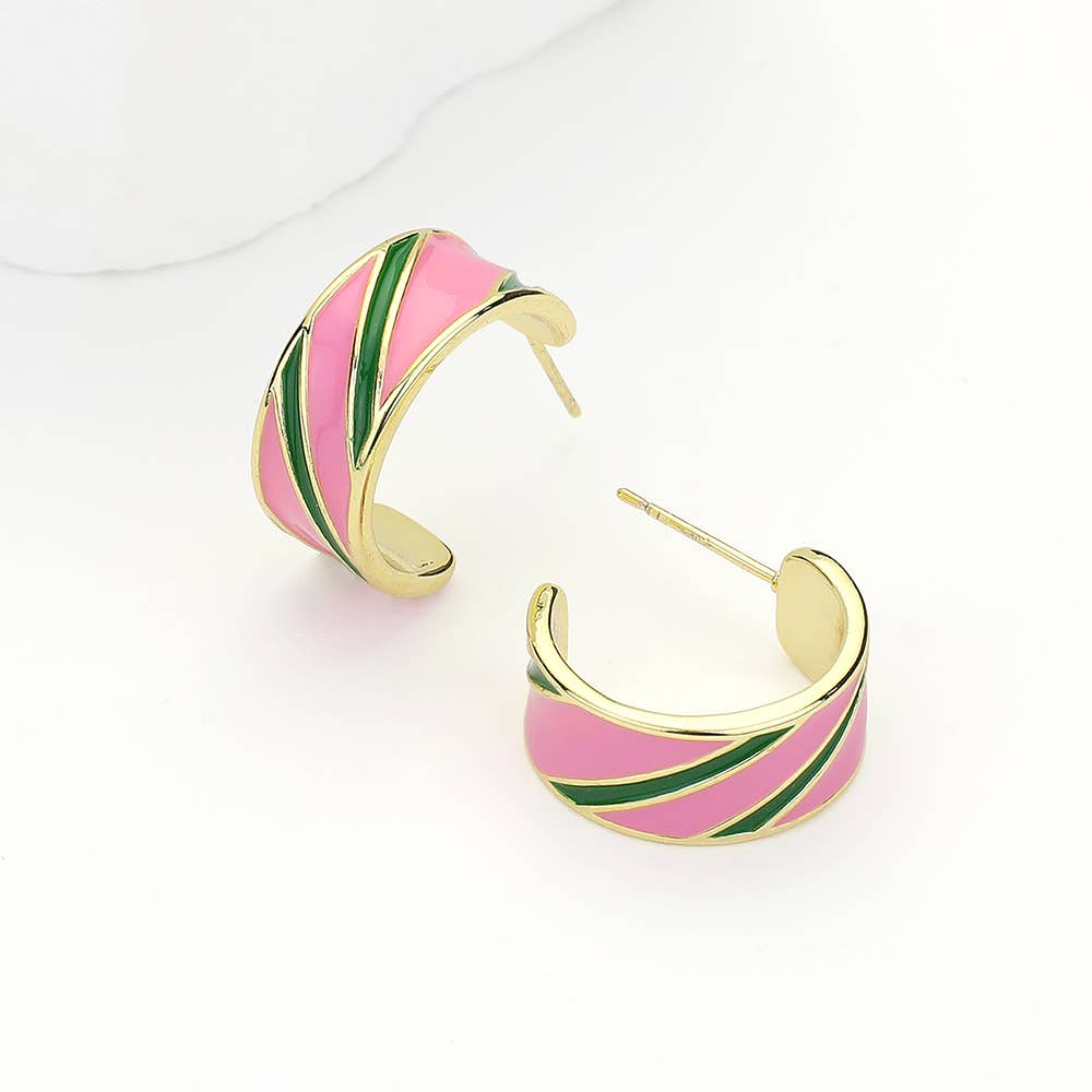Add a playful yet sophisticated touch to your jewelry collection with these Pink and Green 14K Gold Dipped Enamel Stripe Hoop Earrings. Perfect for any occasion, these chic hoops combine vibrant color and elegant craftsmanship.
