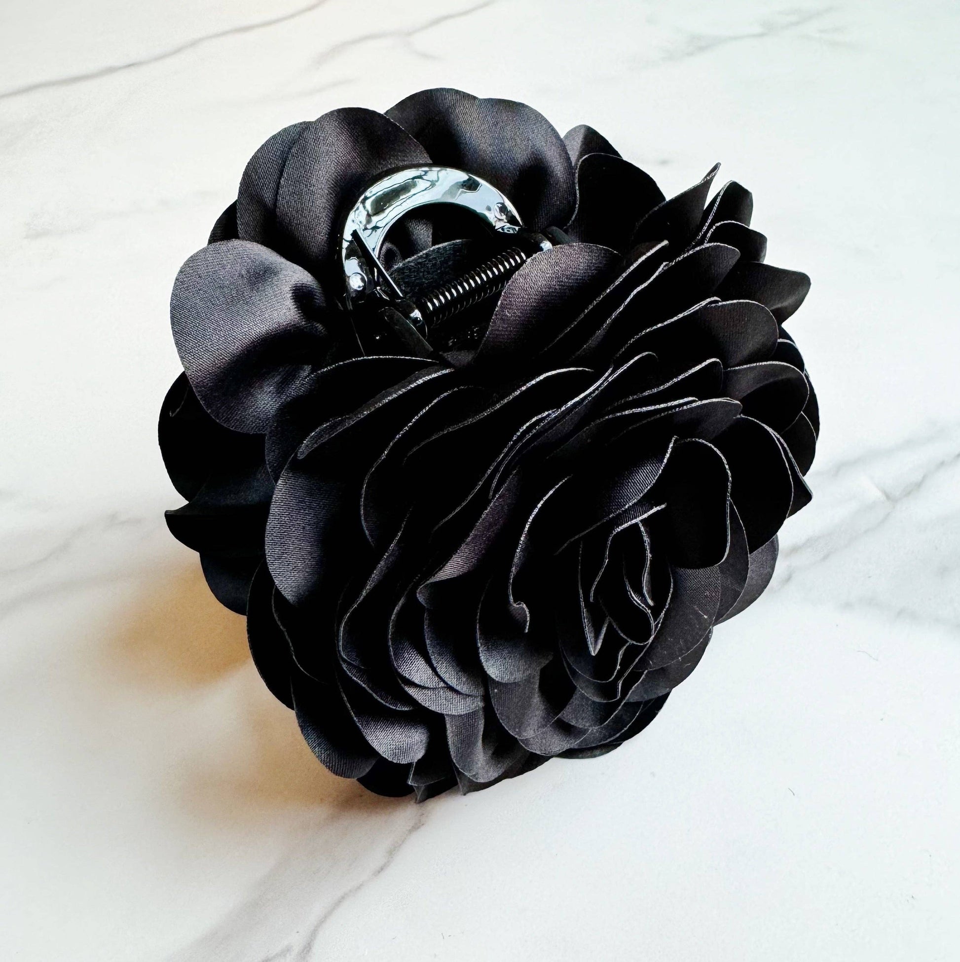 This Full Bloom Double Sided Hair Claw features a delicately bloomed flower design and a convenient double-sided design. With a touch of elegance and functionality, it makes for the perfect addition to any hairstyle. Elevate your hair game with this versatile hair accessory. Dimension: Approximately 4.5”(L) x 4.5“(W) x 2”(H) Medium capacity to hold hair