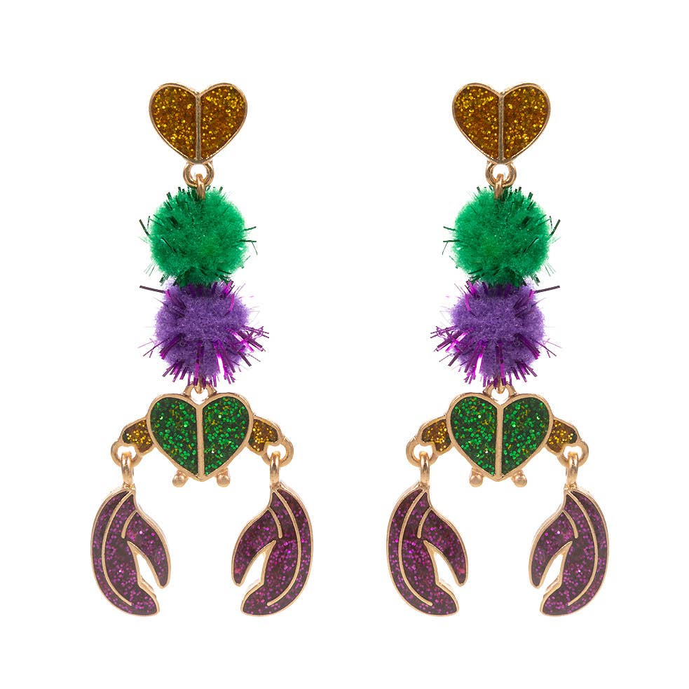 Glittered Enamel Pom Pom Mardi Gras Crawfish Earrings
