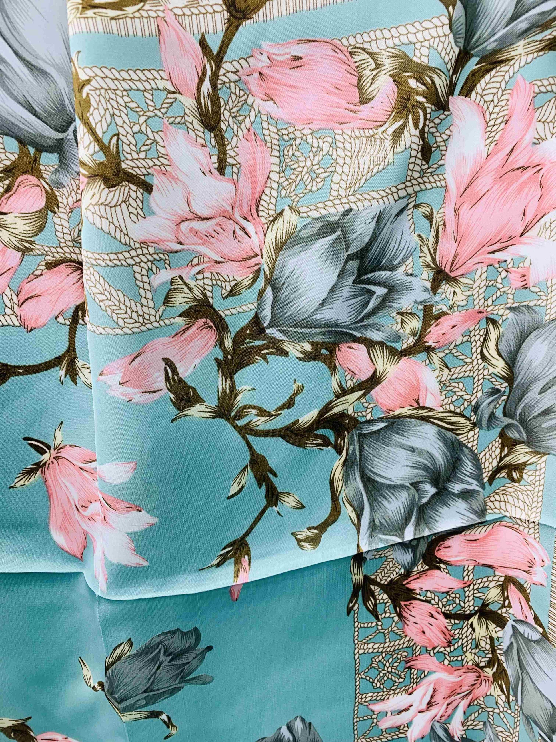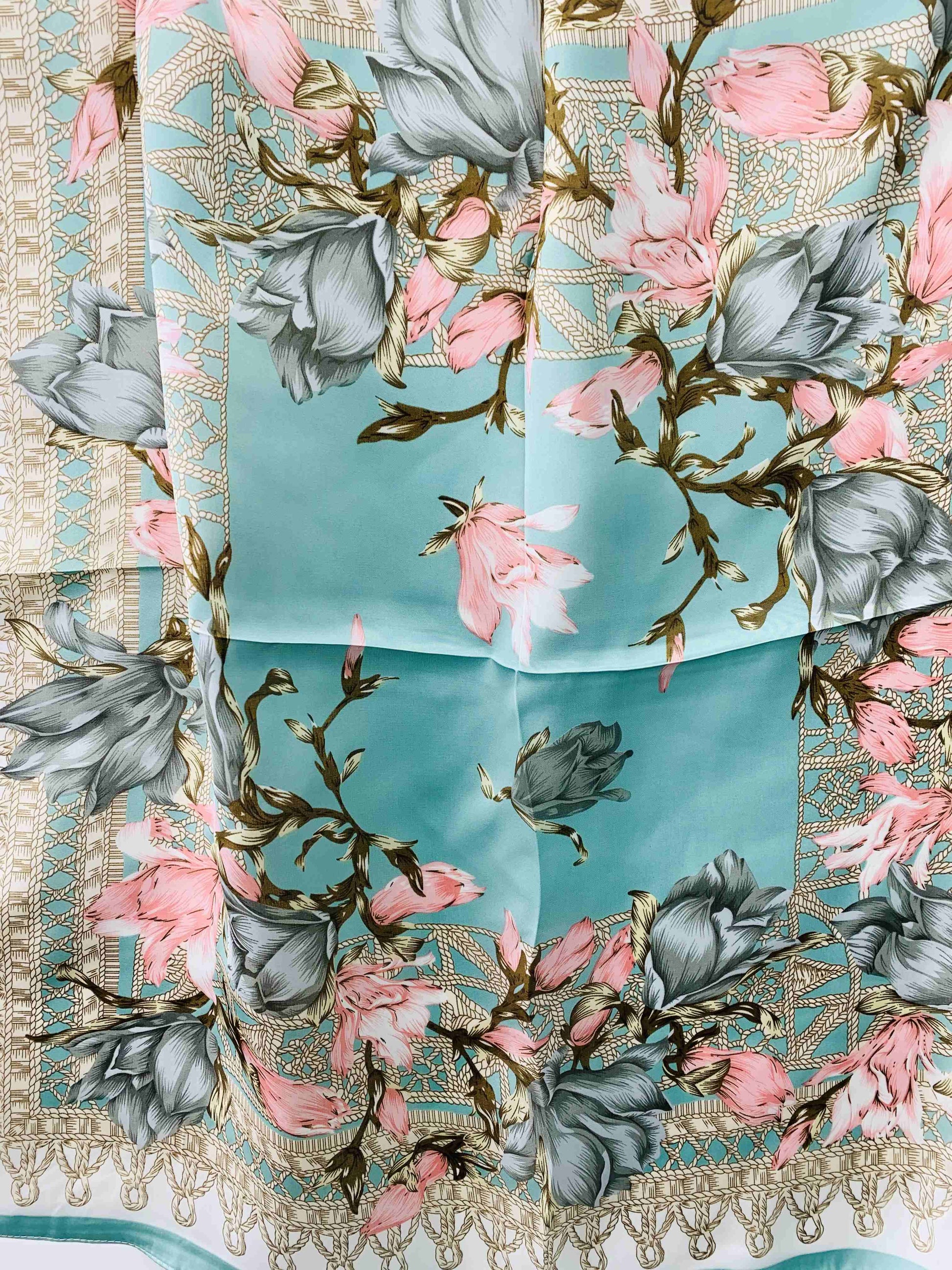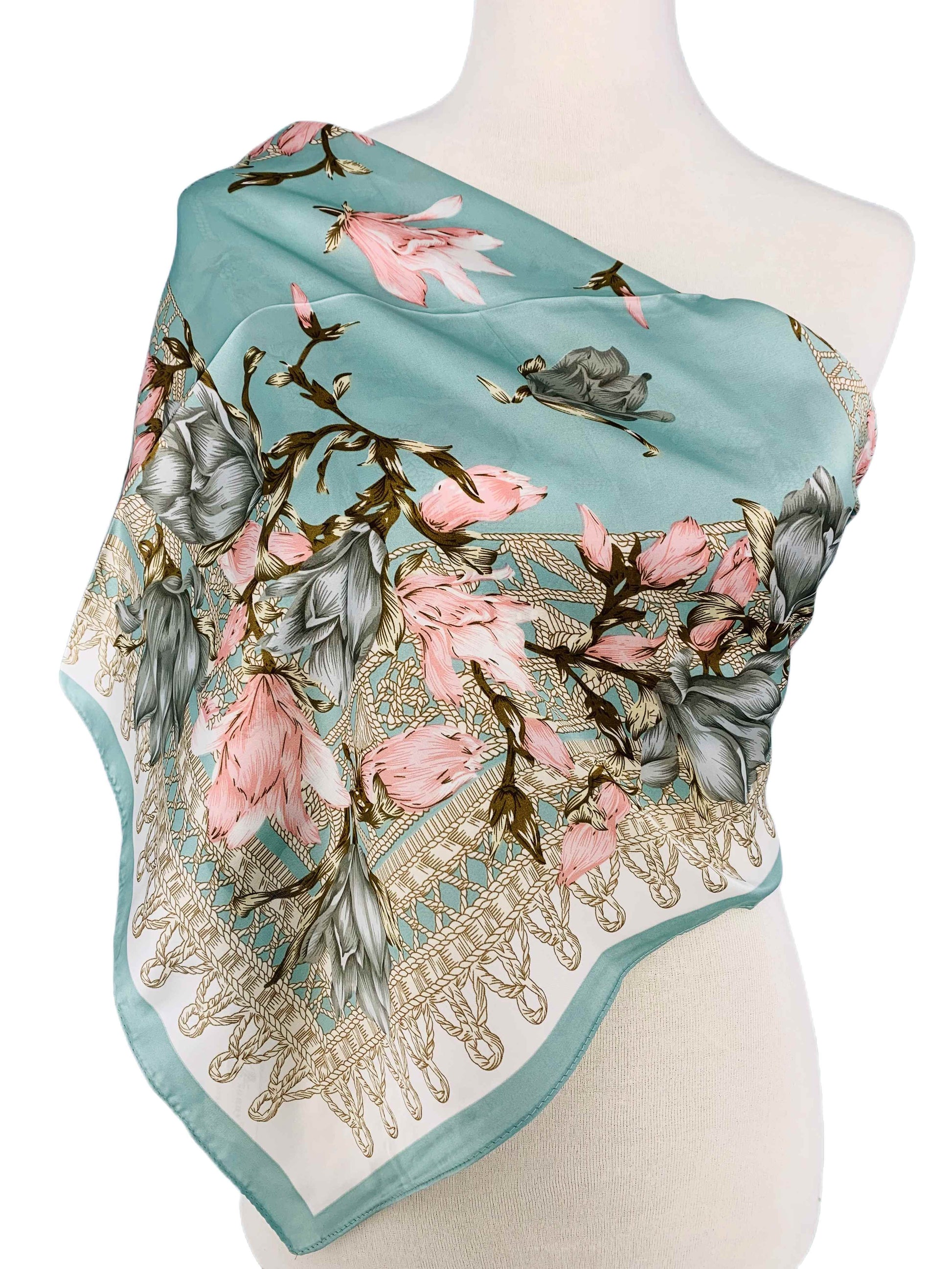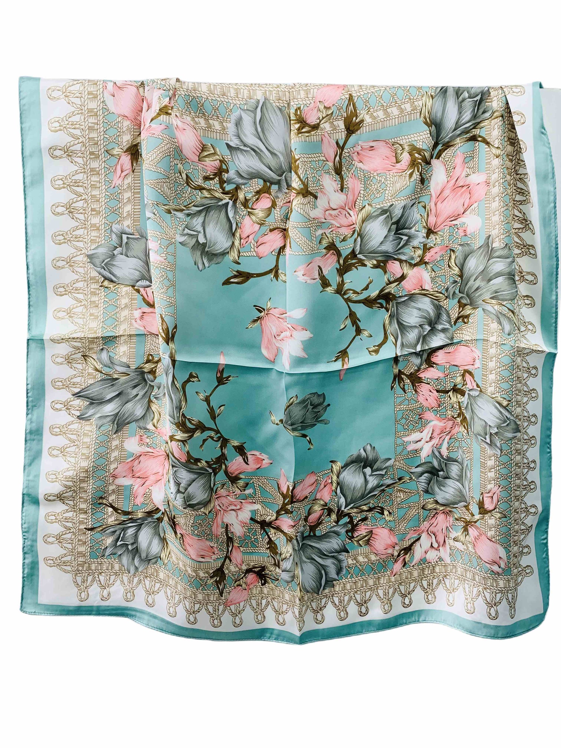 Luxurious Silky Square Scarf--Aqua & Pink Floral