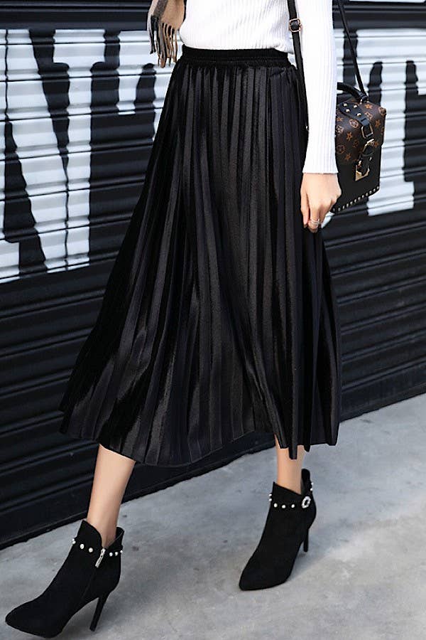 Discover the elegance of our Midi Pleated Skirt. This skirt is a standout piece with its metallic pleating, designed to catch the light and add a touch of glamour to any outfit.