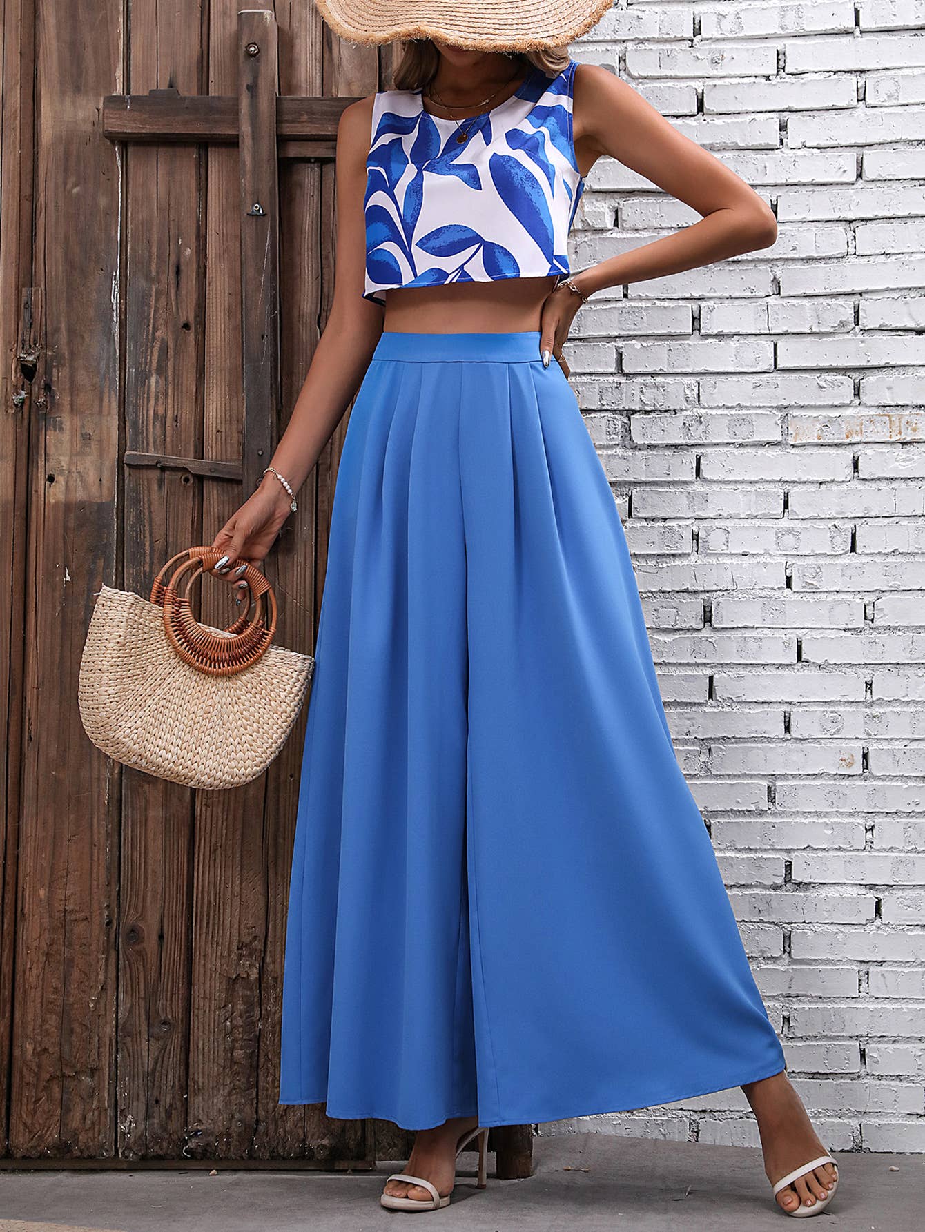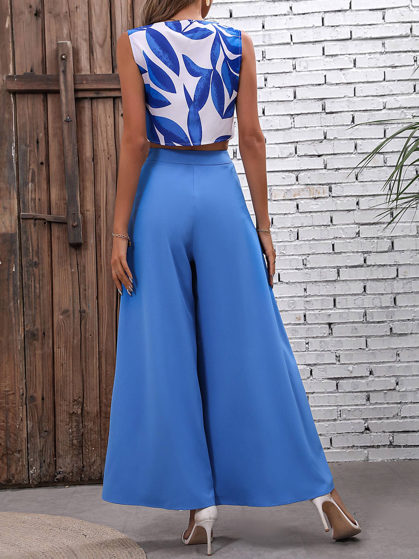 Add a touch of sophistication to your wardrobe with this stunning blue and white tank-style crop top and blue wide-leg pants set. The crop top features a sleek, sleeveless design with a flattering neckline and leaf pattern that exudes effortless style. The matching blue wide-leg pants offer a relaxed fit with a high waist, creating a balanced and elegant silhouette. Perfect for summer outings, casual gatherings, or a stylish day out, this coordinated ensemble is both versatile and eye-catching