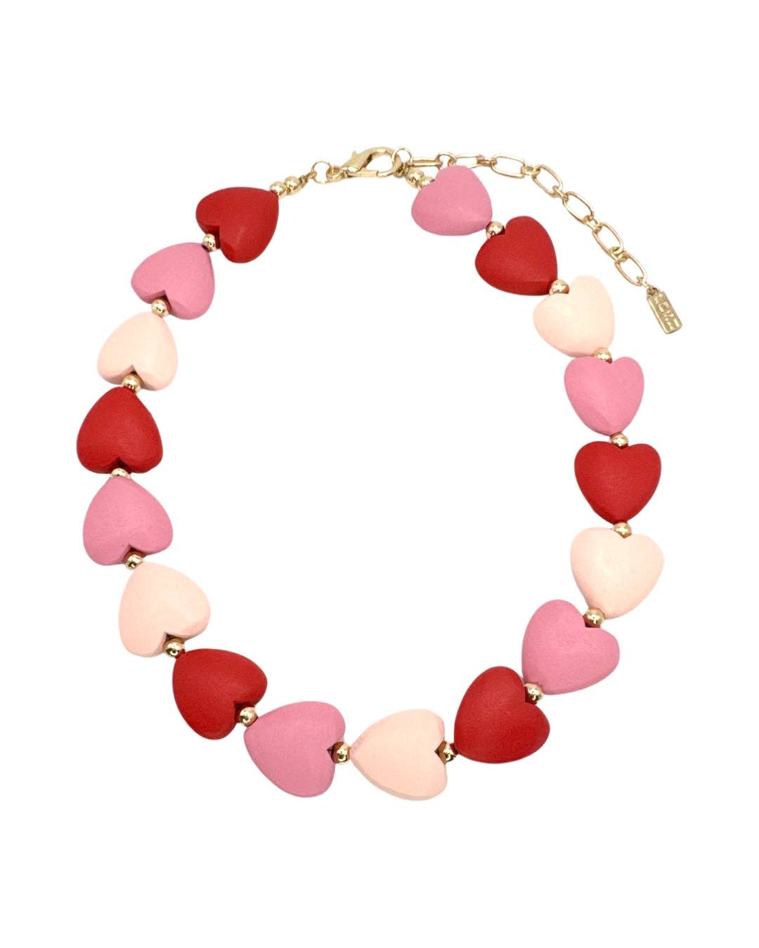 Puffy wood Valentine heart necklace with tiny gold beads. Approximately 16 inches with a 2 inch extender chain.